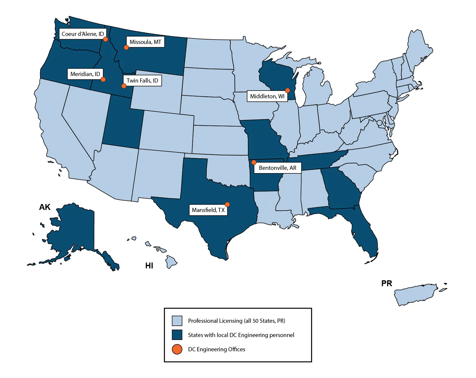 DC Engineering serves a variety of clients, ranging from small businesses to national/multi-national corporations. Our clients and projects take us all over the country, and we are licensed in all 50 states and Puerto Rico. To partner with our clients effectively, DC Teams and personnel are organized both geographically and around industry-based markets.
